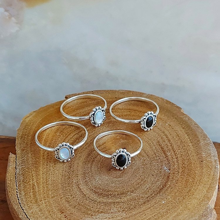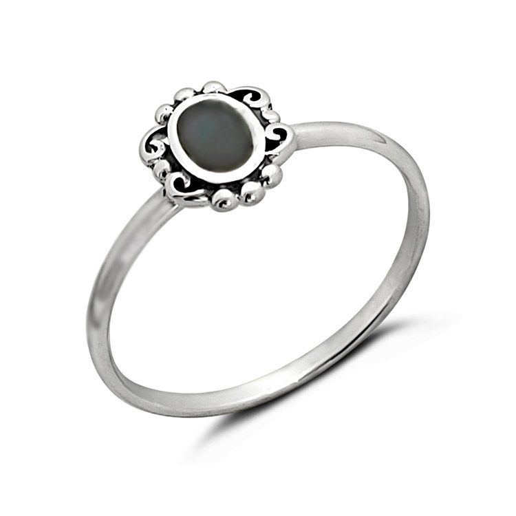 This is a black enamel ring with a decorative pattern around the edge. This is one several similar rings available in this style and is also available with a white mother of pearl shell insert.