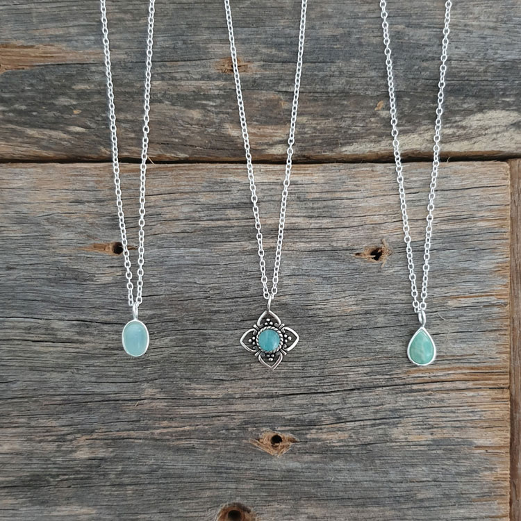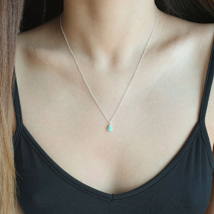 This is a classic water drop or pear shaped amazonite 925 sterling silver necklace. Please note this is a naturally occurring stone and it will vary from piece to piece. This beautiful stone is used in a number of items within the Studio Jewellery range.