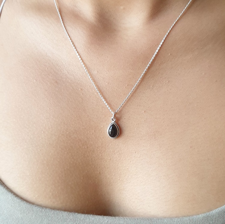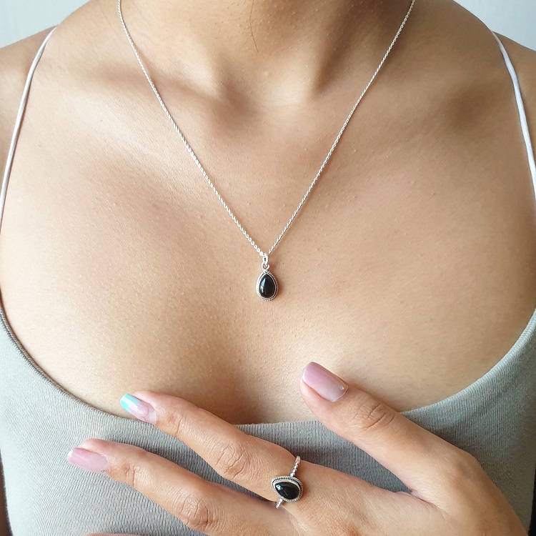 This 925 sterling silver necklace features a beautiful black onyx gemstone in a waterdrop or pear shaped design. It is slightly oxidised along its rope edged pattern and there is also a matching ring available. It is also available in Moonstone, Larimar and Turquoise – which all have matching rings.