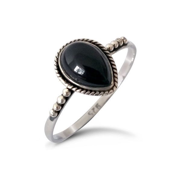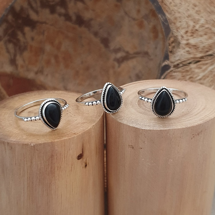 This is a beautiful polished Cabochon Water Drop shaped Onyx gemstone ring in 925 Sterling Silver where the black colour will match with virtually anything. The head is just a stunning shape and the serrations have been darkened by the oxidisation process to give it that aged or old world look. It is available in 3 sizes and there is also a moonstone variation.
