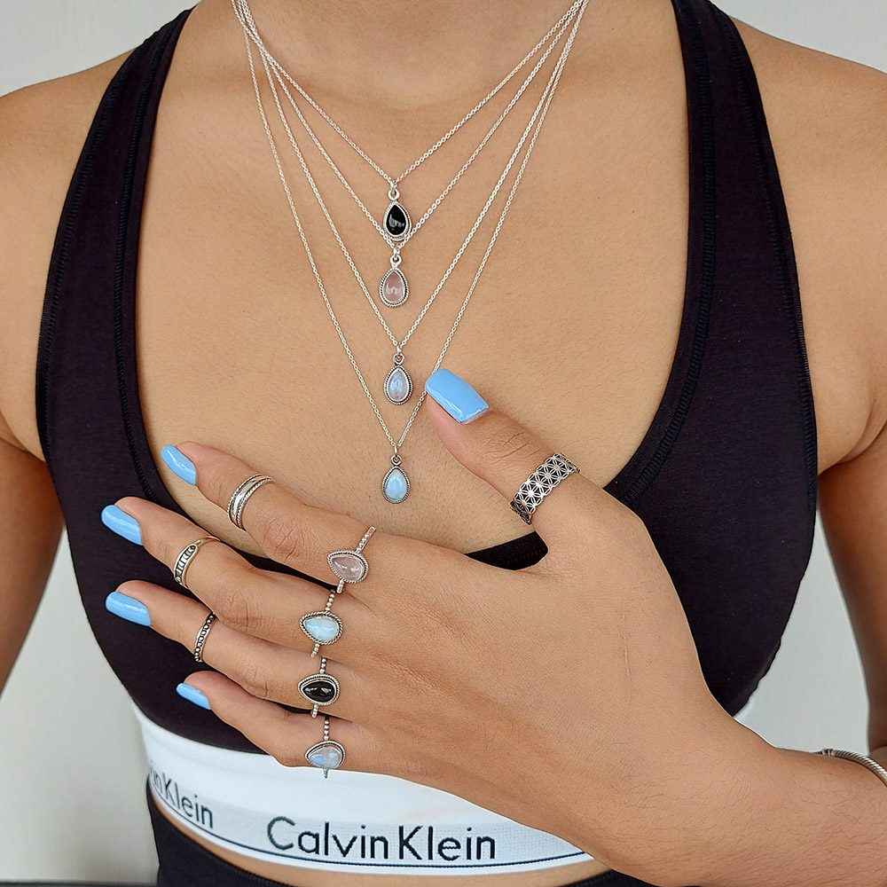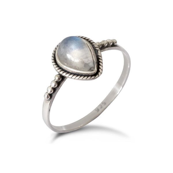 The Water Drop shaped Rainbow Moonstone Sterling Silver Ring has a polished head (Cabochon) as opposed to faceted (Cut) to show off its beautiful iridescence. The band is fine with 4 small beads close to the head which is slightly oxidised to give it that antiqued look – a stunning ring in a boho free spirit theme.