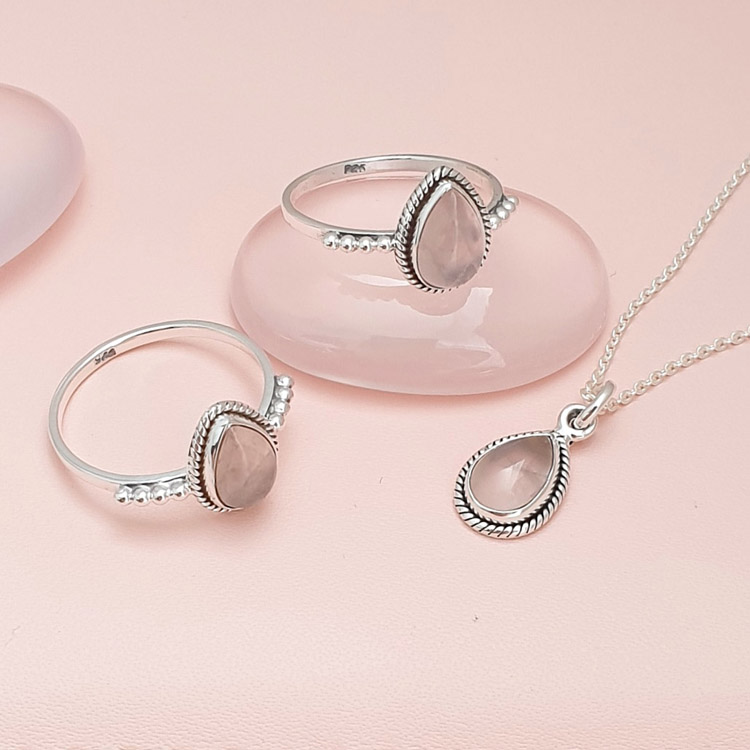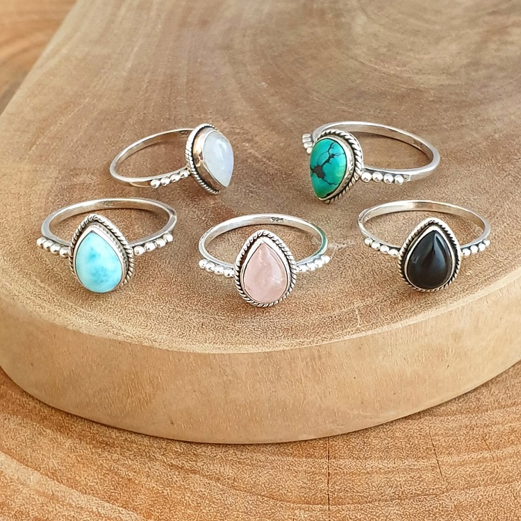 This is a beautiful polished Cabochon Water Drop shaped rose quartz gemstone ring in 925 Sterling Silver where the colour is a subtle pink hue. This item is also available in Oynx, Rainbow Moonstone, Larimar and Turquoise