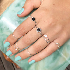 This is a black onyx gemstone ring in 925 sterling silver with 6 distinctive groups of 3 beads around the circle head. This ring is also available in moonstone, turquoise and onyx.