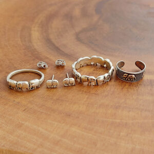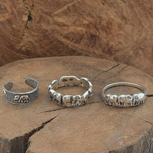 This sterling silver ring has 3 elephants, trunk to tail on the face with a total width of 5mm, while the band is a fine 2mm. The details have been slightly oxidised to give it a more boho look.