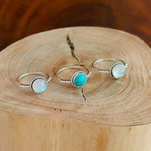 This beautiful 7mm circle rainbow moonstone gemstone is set in 925 sterling silver with a boho look and theme.