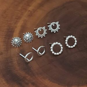 These are a pair of circle sterling silver stud earrings with distinctive small balls around the edge.