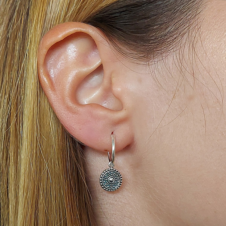 Beaded Disc Silver Hoops are the perfect fashion accessory for any occasion. The round disc makes the earrings look simple and elegant. Our hoops have the perfect amount of detail, with just enough sparkle to make you feel glamorous. We also have other hoops with various unique designs available in stock.