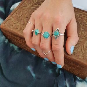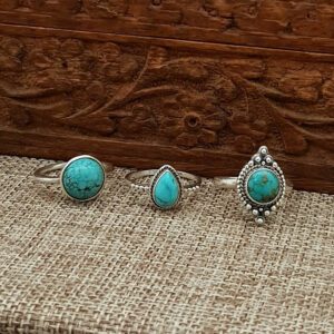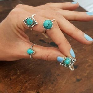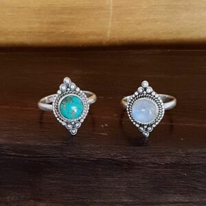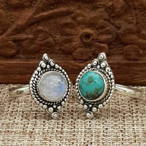 This is a beautiful turquoise statement ring in 925 sterling silver which features a round dome shaped stone with an outer rope pattern which sits on a marquise shape design featuring small beads on the edge. We also have a number of other similar turquoise and rainbow moonstone silver rings.