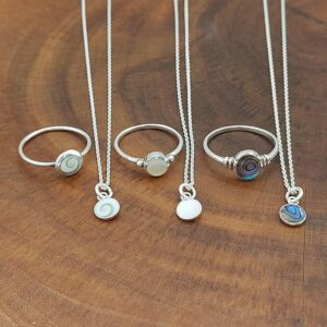 This 925 sterling silver necklace features a beautiful natural shell disc pendant in a Shiva or Cats eye pattern. There are also matching hoop charm earrings and this necklace is also available in abalone and white mother of pearl.