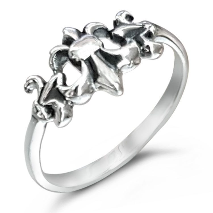 The fleur de lys sterling silver ring with slight oxidisation features a very popular pattern dating back hundreds of years. Literally, the flower of lily is a symbol synonymous with France but also seen throughout Europe on the coat of arms of many families.