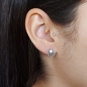 Embrace elegance and classic style with Floret White Shell silver studs. This stunning sterling silver studs feature a unique white shell inset and intricate rope-like design with beads and flower petals.