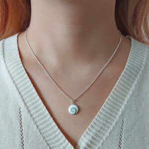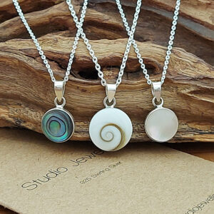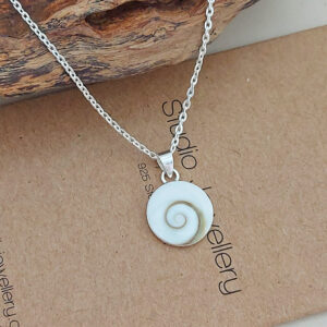 Embrace the beauty of the ocean with our stunning Shiva Shell silver necklace. Crafted in sterling silver, this 45cm necklace features a unique 12mm circle pendant adorned with a mesmerizing shiva shell inset. Perfect for everyday wear, this piece is sure to turn heads and make a statement.
