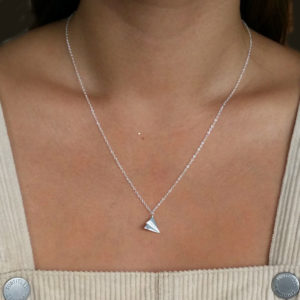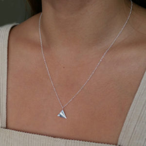 This is a geometric origami plane sterling silver necklace. This combines 2 very popular themes, origami and travel – both of which are eternally on trend.