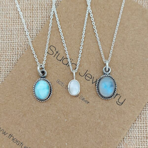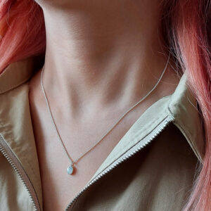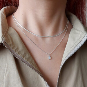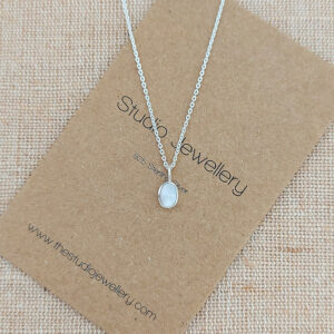 Our Tiny White Oval Shell Silver Necklace crafted from 925 Sterling silver, featuring a delicate oval pendant with a tiny white shell inset. Perfect for adding a touch of seaside charm to any outfit.