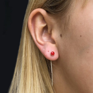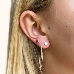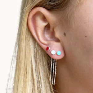 These are classic sterling silver chain threader earrings in 925 sterling silver with a unique 5mm disc at one end and a small bar at the other end. This style is available in 3 colours (red, white and turquoise) as well as in plain silver.