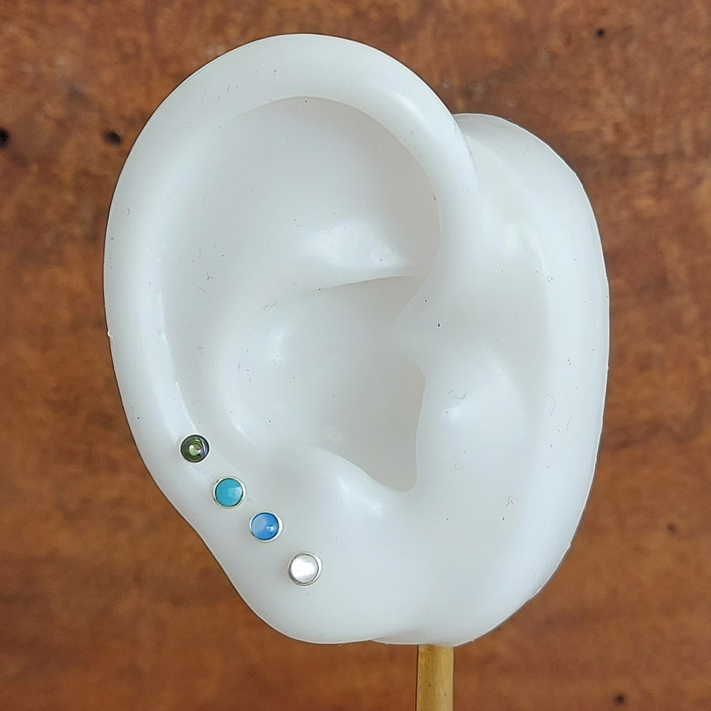 These are classic circle studs in a tiny 3mm size made of 925 sterling silver and turquoise colour. These exact same studs can be purchased in white, blue or abalone shell.