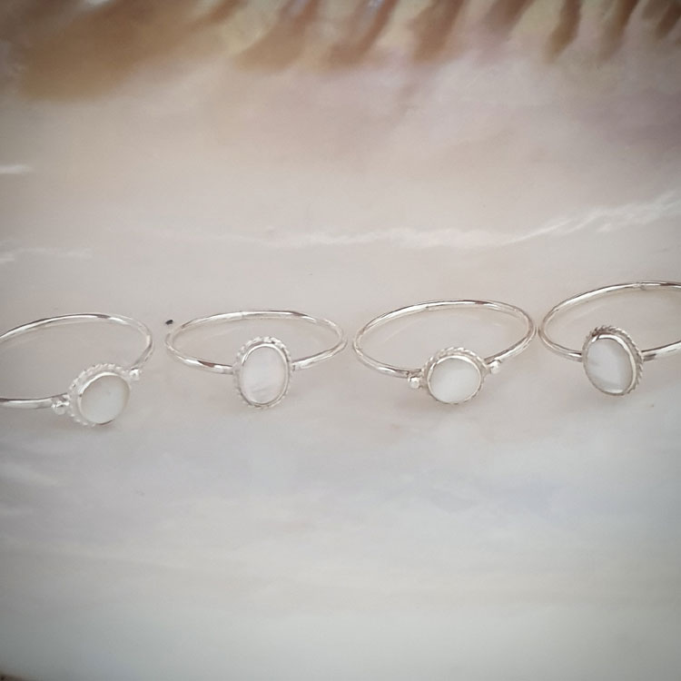 This oval shaped white shell 925 sterling silver ring has a distinctive rope edged pattern. It is based on the nearly identical design that we have in turquoise which has been one of our best sellers.