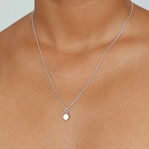 This 925 sterling silver necklace features a beautiful natural white mother of pearl shell disc pendant. There are also matching hoop charm earrings and this necklace is also available in abalone and shiva shell.
